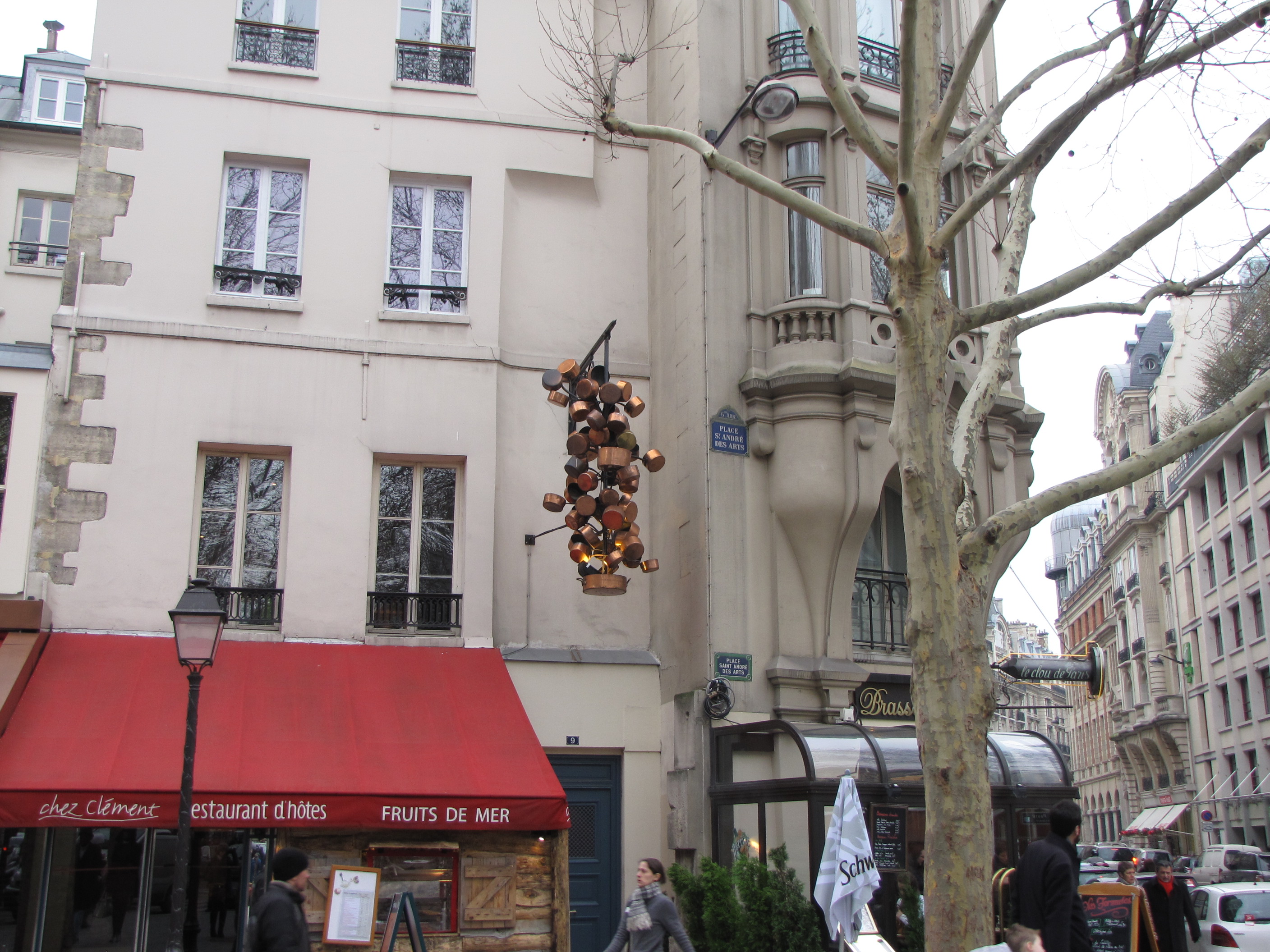 So I took a detour and rediscovered the Fountain of Saint Michel. The water wasn’t flowing, but the statues and columns were just like they were four years ago. And, just like at Notre Dame, I made a circle around the attraction. As I was behind it, I was stopped in my tracks by the sight of a hanging collection of copper pots.